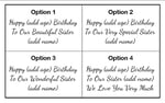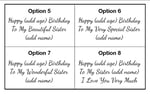 We have 8 text options for the front of your card. View our gallery for text options and confirm the age and name required in the personalisation box at checkout.
